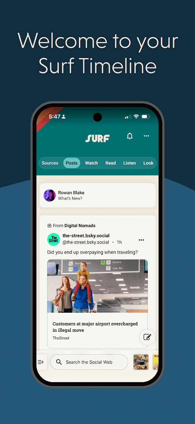 Surf, a browser for the open social web, gives people, publishers and creators a simple way to search for the conversations they care about or create feeds to build community around anything—from events to podcasts. Use Surf to see what people are saying on issues of the day, trends or topics you care about.
